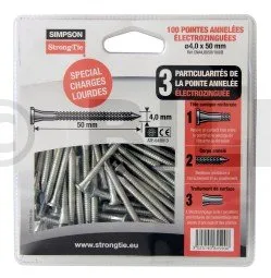 CNA galvanisch verzinkte Kammnägeln werden für strukturelle Montagen von Simpson Strong-Tie Verbindern empfohlen. Alle unsere Tests wurden mit dieser Art von Nägeln durchgeführt. Für mehr Rückverfolgbarkeit auf den Baustellen sind sie mit einem ≠-Stempel versehen, eine Qualitätsgarantie ohnegleichen.