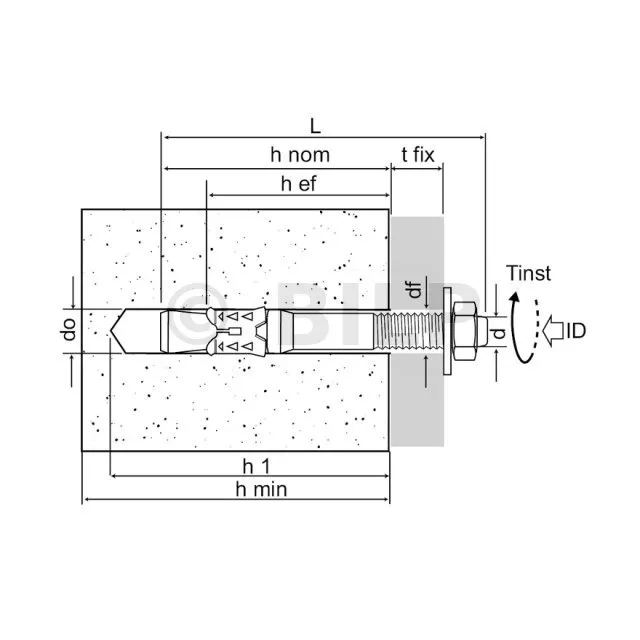 | Referenzen | Produktreferenz | Abmessungen [ØxL] [mm] | Bohr-Ø [d0] [mm] | Prof. min. Bohrtiefe [h1] [mm] | Ø Bohrung im zu befestigenden Teil (durchgehend) [df] [mm] | Schlüsselweite an der Fläche [SW] [mm] | Anziehen Drehmoment [Tinst] [Nm] | Prof. Verankerung [hef] [mm] | Ep. Mindestauflage [hmin] [mm] |