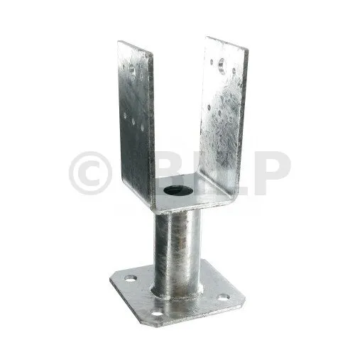 Dieser U-Pfostenträger mit Bodenplatte ermöglicht die Befestigung eines Pfostens auf einer Betonplatte und hält dabei Kräften in allen vier Richtungen stand.