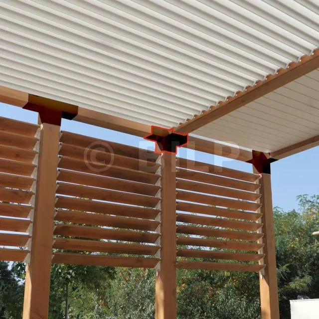 Damit kann eine 120x120mm-Stütze senkrecht zu einem 120x120mm-Chevron angebracht werden, die insgesamt von einem 120x120mm-Vertikaltopf unterstützt wird.