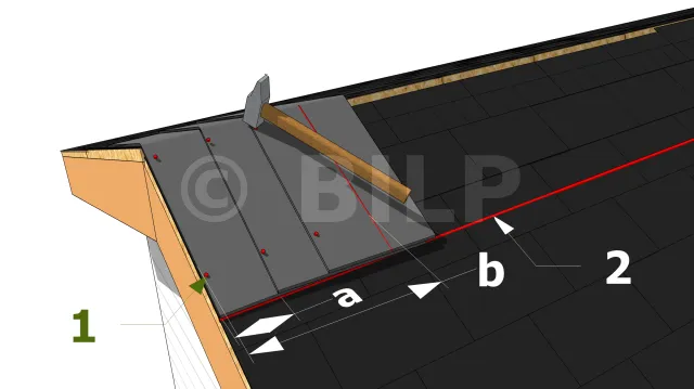 Travaillez le long de la crête vers la direction des vents dominants, de sorte à ce que les chevauchements puissent affronter le vent et la pluie battante. Dans le cas où vous utilisez une faîtière de type 30 cm ; posez les faîtières le long de la crête suivant la ligne de référence tracée de part et d’autre du sommet. La première faîtière doit embrasser la bordure de la bande de rive. Bien clouer la première faîtière. Superposer la prochaine faîtière à 13 cm de la première et clouer-les ensembles par la suite. Suivez les mêmes instructions pour poser les autres faîtières tout en les alignant le long de la ligne de référence.