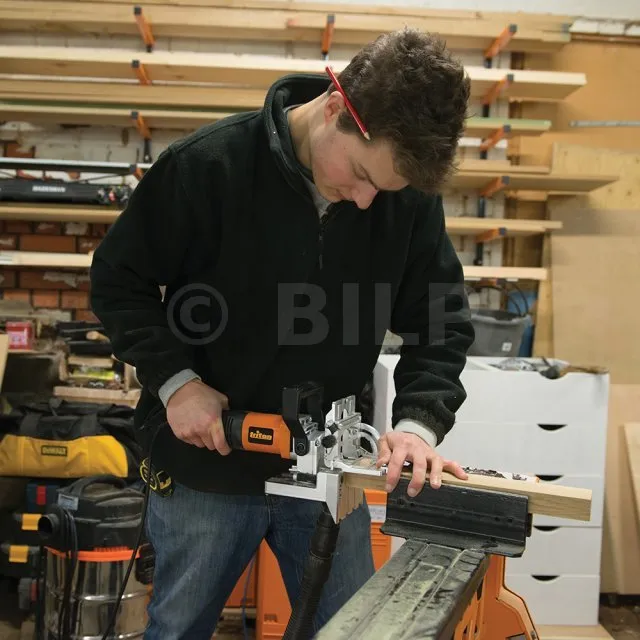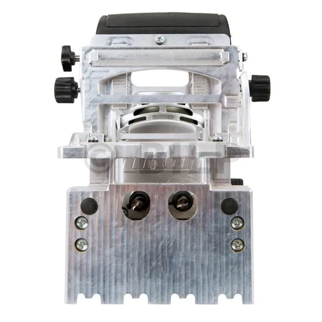 Dübelmaschine mit 710-W-Motor zum Anfertigen von zwei Dübelbohrungen im Abstand von 32 mm (Lochmitte zu Lochmitte) zugleich. Vereinfacht das Aufbauen von Möbeln und Regalen. Ganzmetallmechanismus und -getriebe gewährleisten eine lange Lebensdauer. Von 0°- bis 90°-Winkel einstellbarer Anschlag. Schnelle Bohrtiefeneinstellung von 0 bis 38 mm. Präziser Zahnstangenmechanismus erlaubt eine genaue Höheneinstellung. Transparentes Sichtfenster mit drei Linien ermöglicht exaktes Ausrichten und schnelle Wiederholungen des Bohrvorgangs. Isolierter Handgriff mit Aufbewahrungsmöglichkeit für Sechskantschlüssel. Zwei Bohrer mit je Ø 8 mm und eine strapazierfähige Gerätetasche im Lieferumfang enthalten.