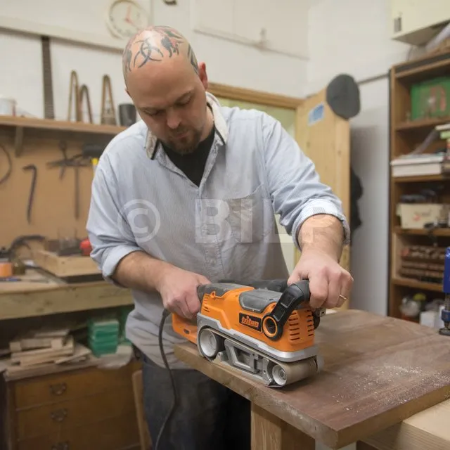 - InhaltBandschleifer 75 mm, 1200 W ; Schleifbänder, 80er-, 100er- und 180er-Körnung ; Satz Stationärhalterungen ; Staubfangbeutel
