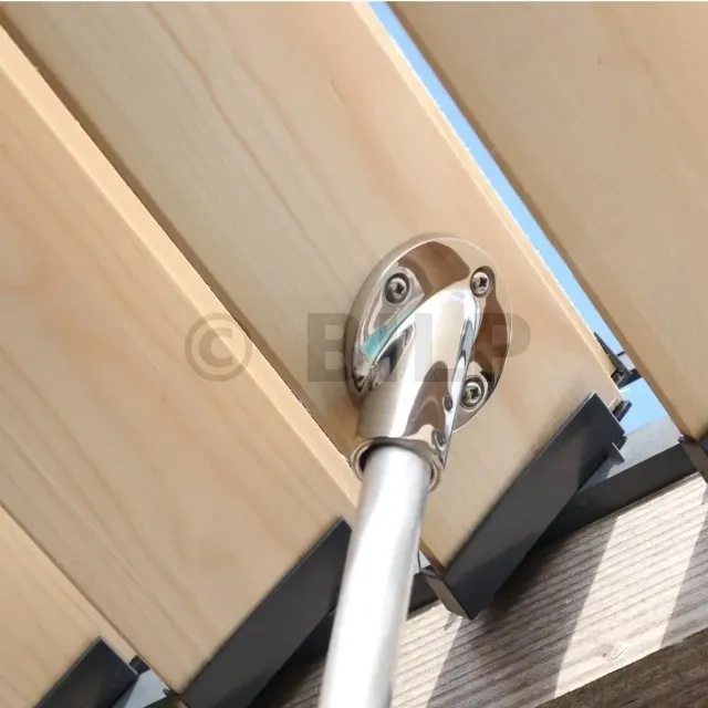 Edehlstahl-Buchstenplatte für die Betätigung der in höhenverstellbaren Lamellen. Die Buchsenplatte ist auf einer Lamelle befestigt und ermöglicht die Aufnahme der abnehmbaren Betätigungsstange. (Die Stange ist in BAUSATZ) geliefert.