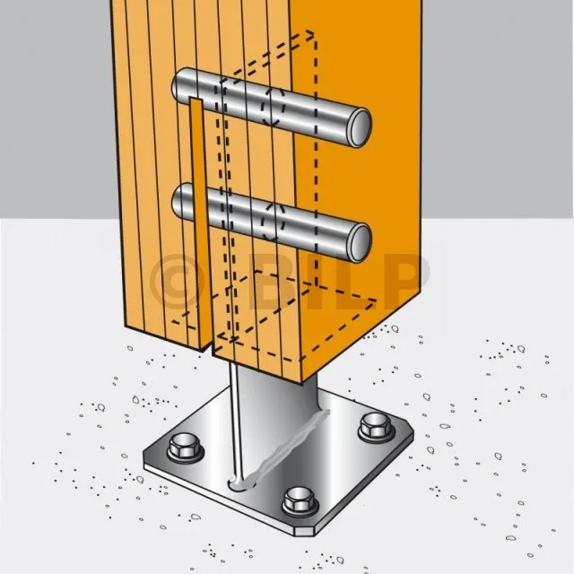 - Holzverbindung auf starrem TrägerAm Pfosten : 2 Edelstahldorne Ø12 oder Ø16 oder Edelstahlbolzen Ø12 mm oder 16 mm je nach Bohrung ; auf Beton : 4Ø12 (BOAX-II-Dübel M12-104/5 A4 ; Gewindestange M12) ; auf Stahl : Edelstahlbolzen Ø12