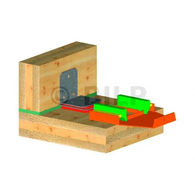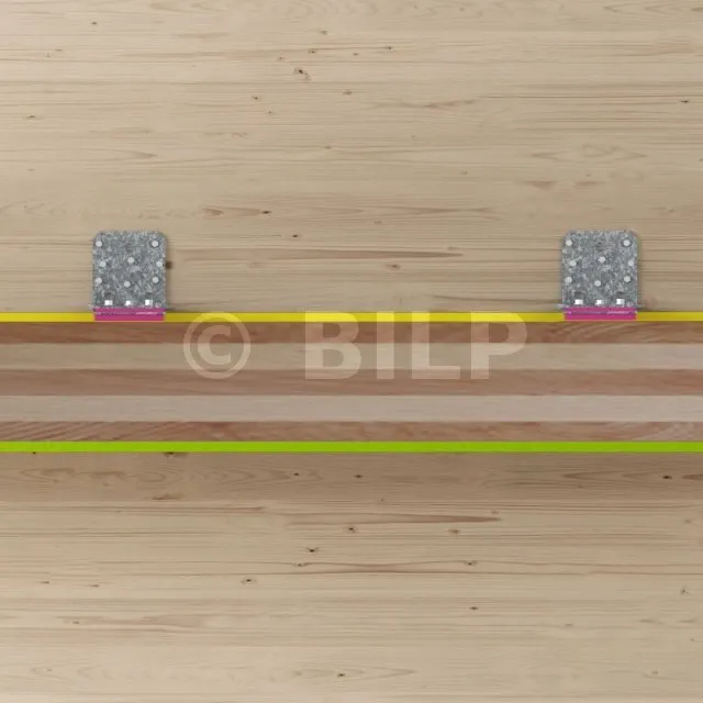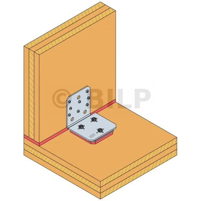 Für absolute Effizienz ist das Vorhandensein eines Sylodyn®-Streifens unter den CLT-Wandpaneelen zwingend erforderlich. Die Auswahl der Sylodyn® Streifen hängt vom Gewicht der Wand ab (siehe Tabelle unten). Zur besseren Montage des ABAI-Winkelverbinders ist eine Montageschablone (Ref. MOABAI) erhältlich. Sie verhindert das Zusammendrücken des Sylodyn®-Streifens unter dem Winkelverbinder.