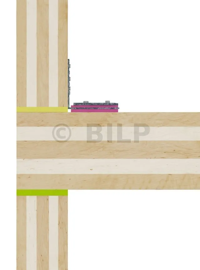 Der Schallschutzwinkel ABAI ist ein innovativer Bügel, weil er einen klassischen Winkelverbinder mit einem schalldämmenden Material, Sylodyn®, kombiniert. Er ermöglicht die Verbindung von Wand- und Bodenelementen aus Mehrschichtplatten (CLT) und garantiert gleichzeitig die Schalldämmung zwischen diesen Bauteilen dank eines 12 mm breiten Streifens aus Sylodyn®, der unter dem Winkel vorinstalliert ist.