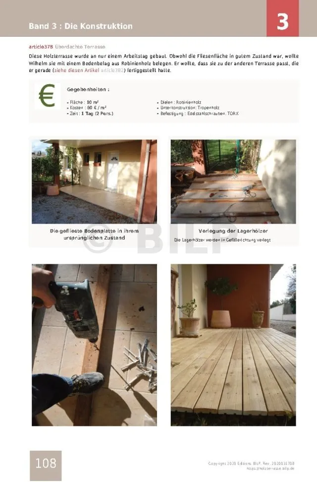 konkrete Informationen für Ihr Projekt. Alle Geheimnisse, Tipps und Tricks, um Ihre Terrasse zu einem Erfolg zu machen. Alle Techniken und Produkte werden Ihnen in objektiver und unabhängiger Weise beschrieben. Detaillierte Ansichten beschreiben alle Bauphasen.