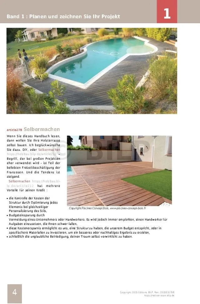 Nicht umsonst ist die Anleitung zum Bau von Holzterrassen fast 200 Seiten lang. Machen Sie Ihren Traum nicht zum Alptraum. Die Beratung durch einen Experten macht den Unterschied zwischen einem mittelmäßigen oder gescheiterten Projekt und einem Gesamterfolg, auf den man stolz sein kann.