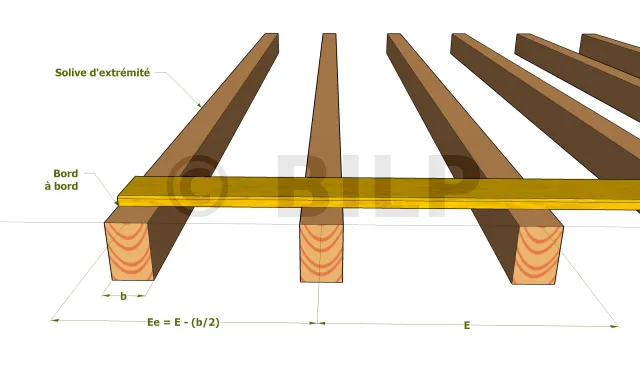 La solive qui se situe à l’extrémité de la plateforme doit être déplacée un peu vers l’intérieur de façon à ce que l’extrémité de la planche ou du panneau s’aligne au bord extérieur de la solive. L’entraxe à l’extrémité est noté Ee1 et est légèrement inférieur à l’entraxe E, d’une demi-largeur de solive en fait.