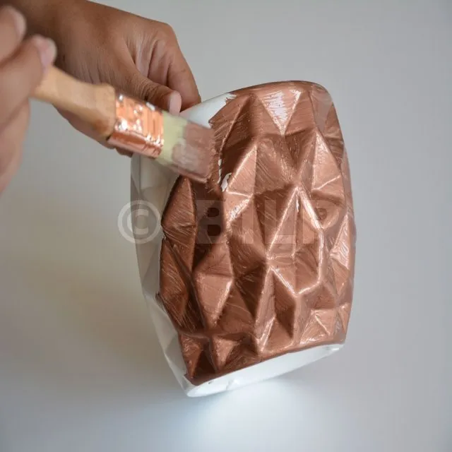 - Es ist möglich, die Dekoration nach vollständiger Trocknung durch erneutes lokales Auftragen von REACTIV LEAF COPPER und/oder COPPER SPIRIT zu korrigieren, um sie nach der oben beschriebenen Methode zu aktivieren.