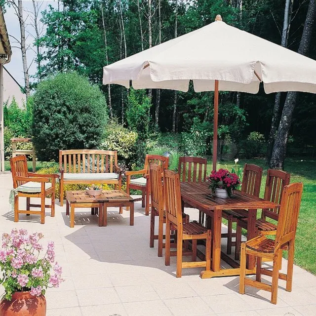 - Exotische Hölzer : Teak und andere Holzarten, die für Gartenmöbel verwendet werden, außer Keruing.