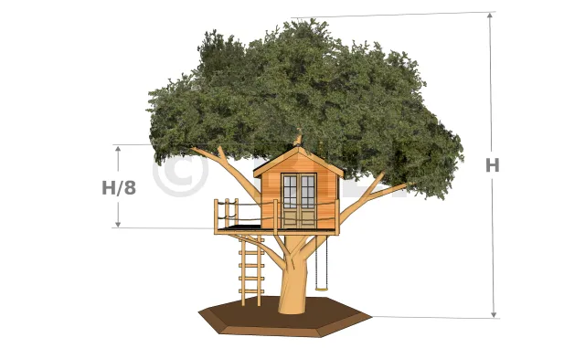 Die führenden Experten für den Bau von Baumhäusern, die selbstverständlich aus den USA stammen, sagen uns, dass es nie ratsam ist, ein Baumhaus über ein Verhältnis von einem Achtel (1/8) hinaus zu bauen. Bei einem 20 m hohen Baum sollte das Baumhaus beispielsweise nicht höher als 2,5 m sein. Außerdem sollte der tragende Stamm am stärksten sein und gleichzeitig seine Wachstumsphase abgeschlossen haben. Es kommt also nicht in Frage, ein Baumhaus auf einem jungen Baum zu errichten.