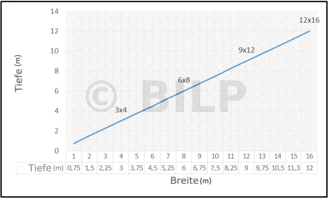 In der allgemeinen Konstruktionstheorie führt die Befolgung des Verhältnisses 3/4 zu guten Ergebnissen. Beachten Sie dazu die folgende Grafik. Beispielsweise passt eine Hütte mit 3 m Tiefe und 4 m Breite oder eine Hütte mit 6 m Tiefe sehr gut zu einer Breite von 8 m.