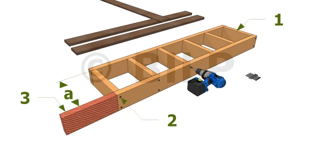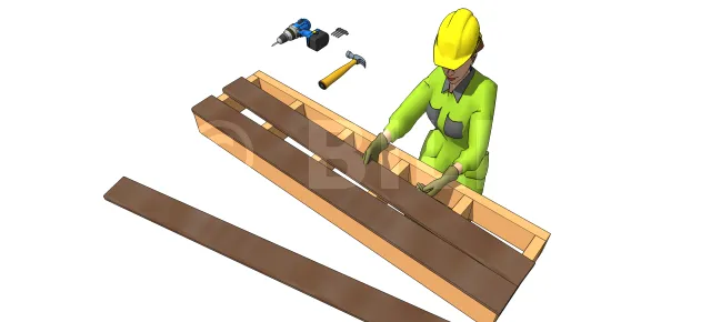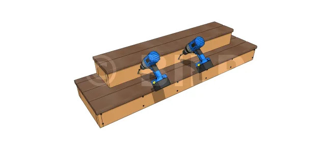 L’étape suivante consiste à couvrir les cadres par des « marches ». On peut utiliser des planches de 3 cm x 15 cm pour cela. Bien aligner le dos et laissez 1 cm de plus à l’avant et sur les cotés du cadre. Aucun espace entre les planches. Utilisez de longues vis pour fixer toutes les intersections (dos, de chaque côté, haut, au niveau des séparateurs, à l’avant…).