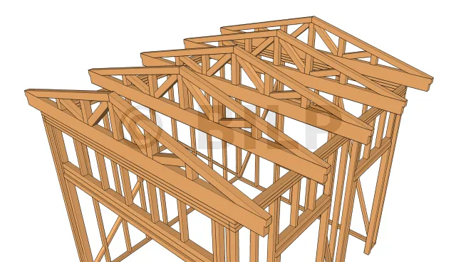 Nomenclature de la toiture: ferme Id. Désignation Section Longueur Qté F1 Entrait 17.5x6.3 cm 356 cm 5 F2 Poinçon 7.5x6.3 cm 39.9 cm 5 F3 Contrefiche 1 7.5x6.3 cm 27.6 cm 10 F4 Contrefiche 2 7.5x6.3 cm 14.3 cm 10 F5 Contrefiche 3 7.5x6.3 cm 57.4 cm 10 F6 Contrefiche 4 7.5x6.3 cm 44.5 cm 10 F7 Arbalétrier 7.5x6.3 cm 184.3 cm 10