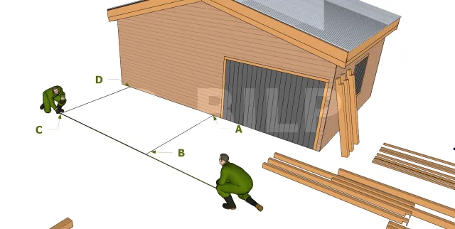Repérer les quatres coins de positionnement des poteaux. Les segments AC et DB doivent être égaux pour avoir un rectangle droit.