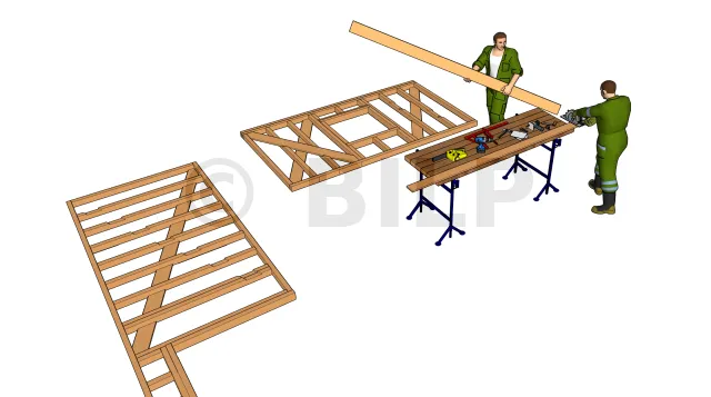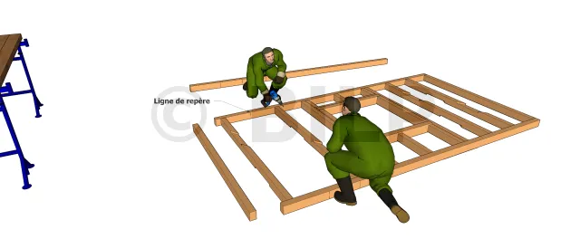 - Commencer par placer les parois latérales sur les points de repère AB et CD. Selon votre type de fondation, vous pouvez fixer directement dans la plateforme avec l’aide des vis ou tire-fonds adaptés et bien évidemment des équerres, de niveaux à bulle. Vérifier l’équerrage de la surface au sol après avoir fixé les deux ossatures latérales, aidez-vous d’un mètre, les diagonales doivent être de mêmes mesures.
