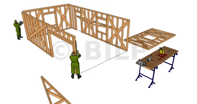 - Placer et fixer ensuite les ossatures des deux façades principales. Ensuite fixer les montants extérieurs de ces façades avec ceux des façades latérales. Et l’ossature générale de l’abri est prête !!