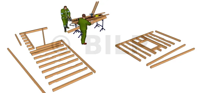 Pendant les découpes, il est essentiel de faire attention aux encoches sur les montants verticaux, ceux-ci vont recevoir les planches de contreventement pour les zones tropicales. Leurs dimensions et leurs angles sur chaque façade ne sont pas égaux, il est donc nécessiare d’avoir les plans à porter des mains.