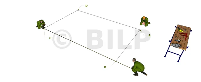 Repérer au sol la surface prise par les ossatures. Prendre un point A (Point de derrière latéral gauche de l’abri) de départ et rapporter la première longueur de la lisse latérale en traçant une ligne droite à l’aide de cordon (4.76 m, point B, point de devant latéral gauche). Prendre ensuite le troisième coin (point C, point de devant latéral droite) en mesurant 8m. Le quatrième point D (point de derrière latéral droite) s’obtient facilement en mesurant 4.76m du point C et 8m du point A. Là vous avez les 4 coins extérieurs des lisses. A la fin, il est nécessaire que les deux segments AC et BD ont mêmes longueurs pour avoir un rectangle parfait à 90°, sinon refaire les cotations.