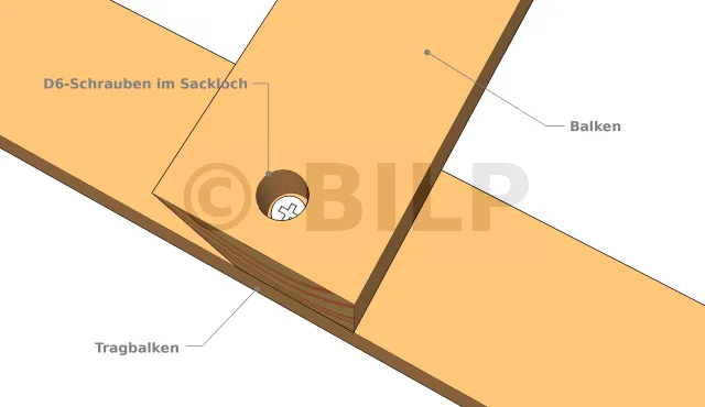 Wenn es die Höhe des Balken erlaubt, kann man die Schrauben von oben am Balken befestigen. Die Schraube muss mindestens 4 cm in den Balken eindringen. Im Handel sind leicht Holzschrauben mit einer Länge von bis zu 150 mm erhältlich. Damit lassen sich auch Balken mit einer Höhe von 110 mm oder weniger befestigen. Man kann auch ein Sackloch in die Oberseite schneiden, sodass der Kopf der Schraube in den Balken hineinragt. Auf diese Weise ist es möglich, Balken mit einer Höhe von 170 mm zu befestigen.