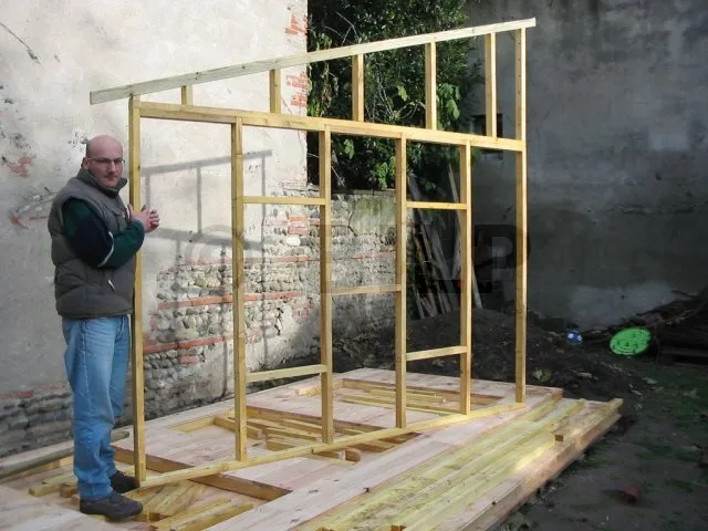 Zuerst bauen wir das Skelett der Wände. Der Rahmen besteht aus vertikalen Ständern, die etwa 50 cm voneinander entfernt sind. Zwischen den Ständern werden Abstandshalter befestigt, um den Abstand zu fixieren und für die Verstrebung zu sorgen. An den Enden werden einen Rähm und eine Schwelle befestigt, die aus denselben Lagerhölzer wie die Ständer bestehen.