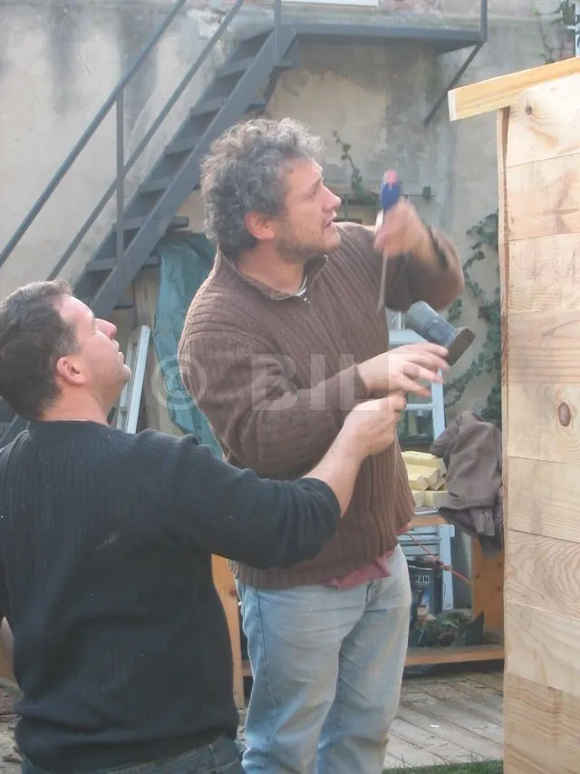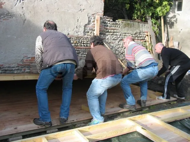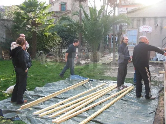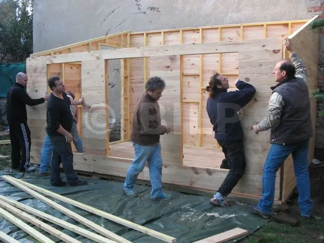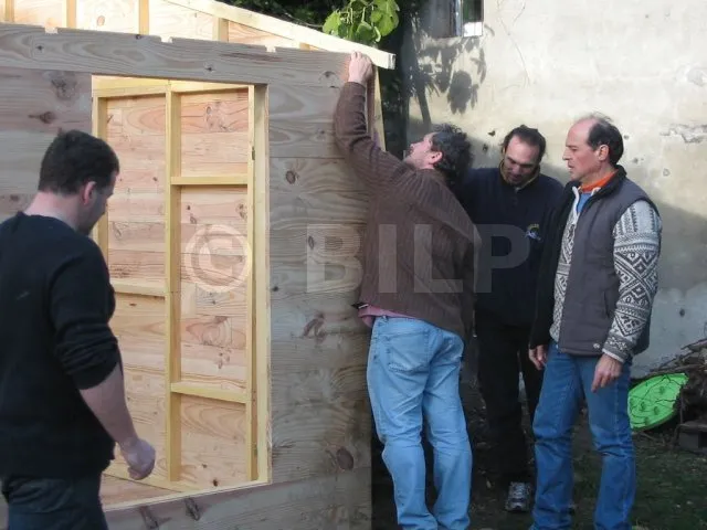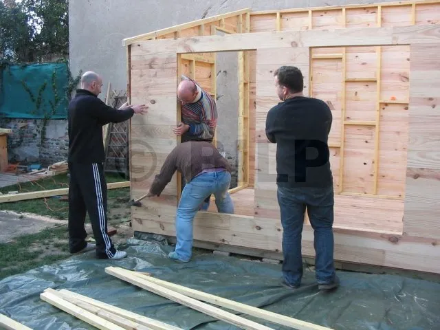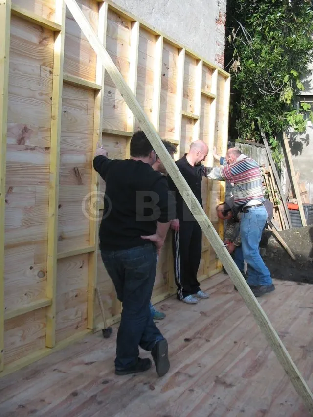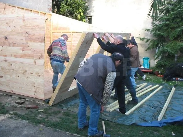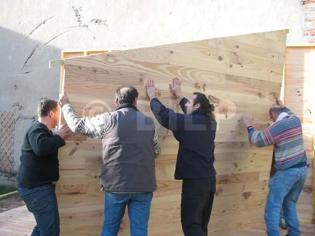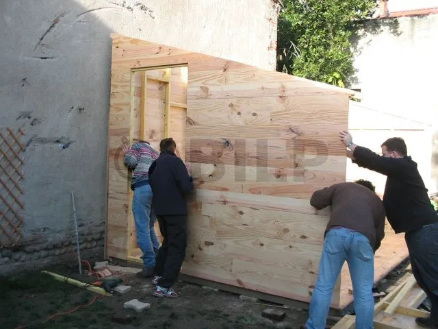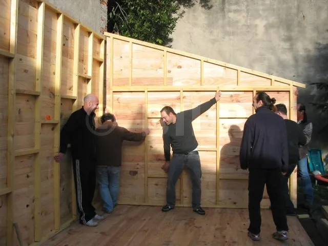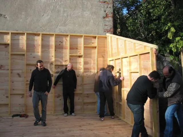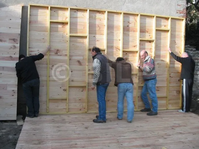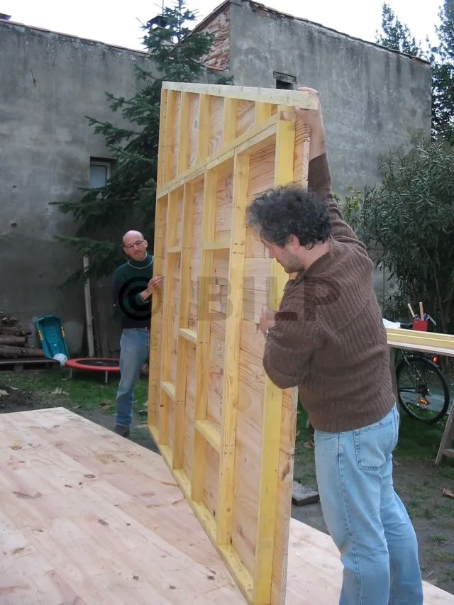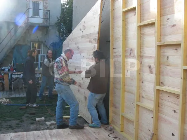 Alle Wände sind fertiggestellt und warten auf ihre Montage. Jetzt ist es an der Zeit, sie eine nach der anderen auf die Plattform zu bringen und zu befestigen. Für diesen Schritt haben wir uns gute Freunde gesucht, denn die Wände sind schwer. Kein guter Zeitpunkt, um sich einen Hexenschuss zu holen!