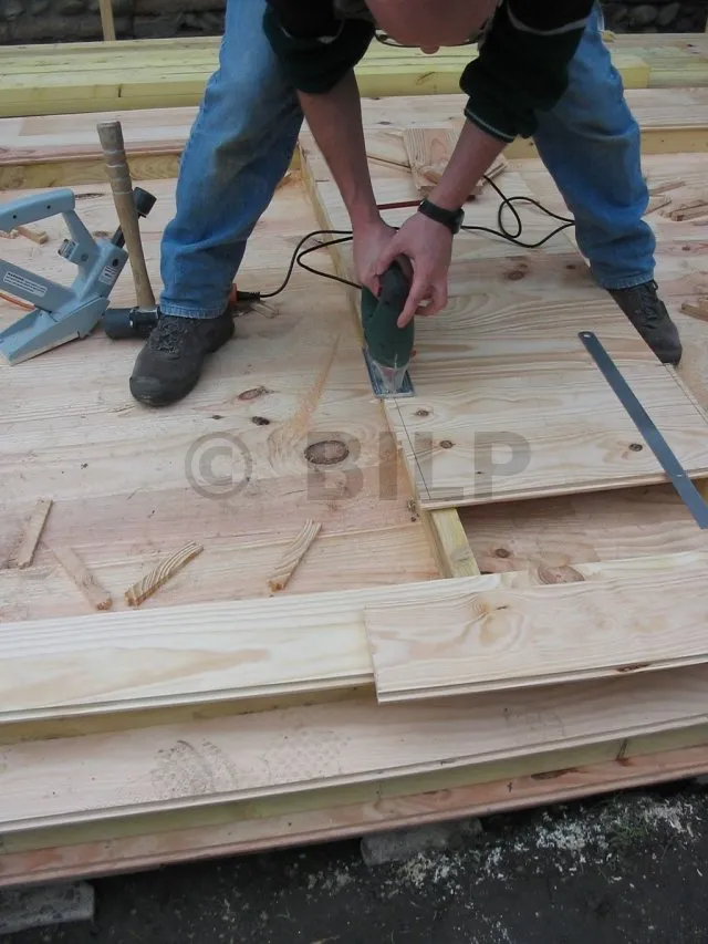 Die Dielen werden grob zugeschnitten und stehen über