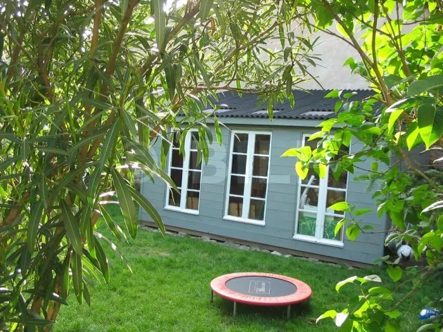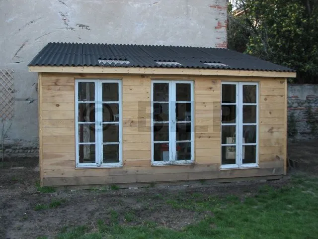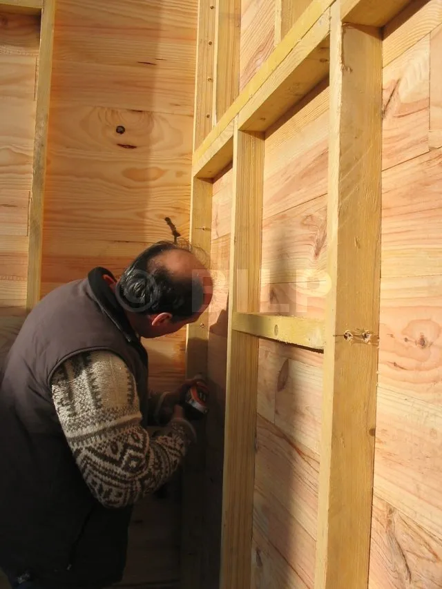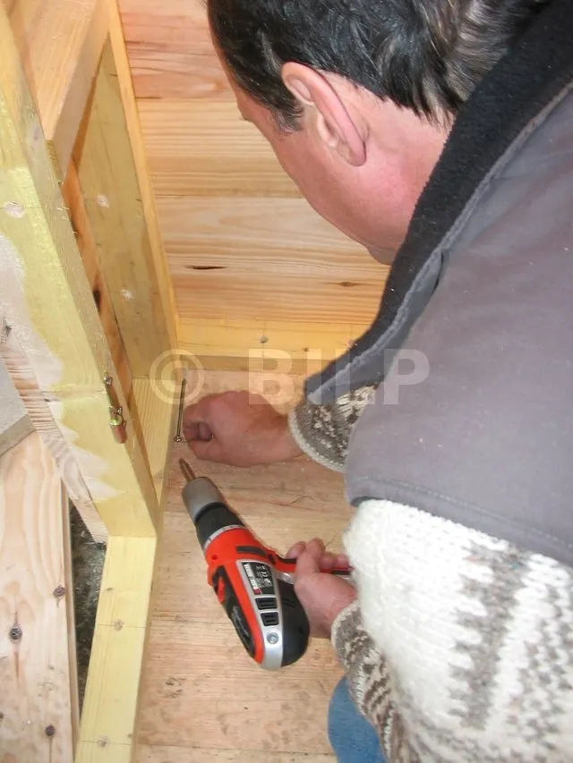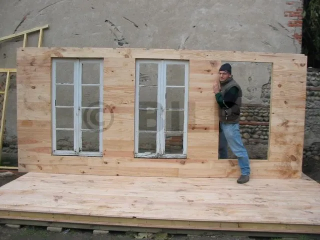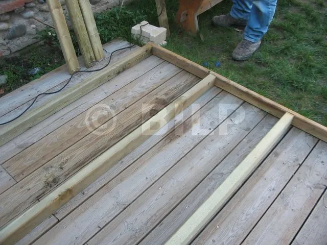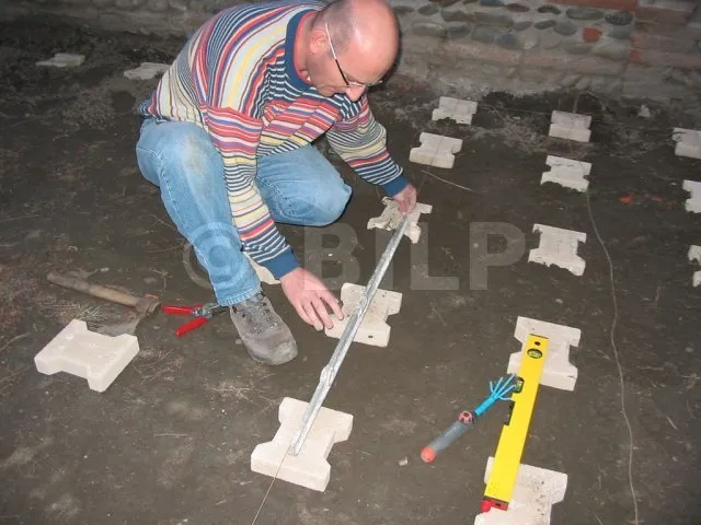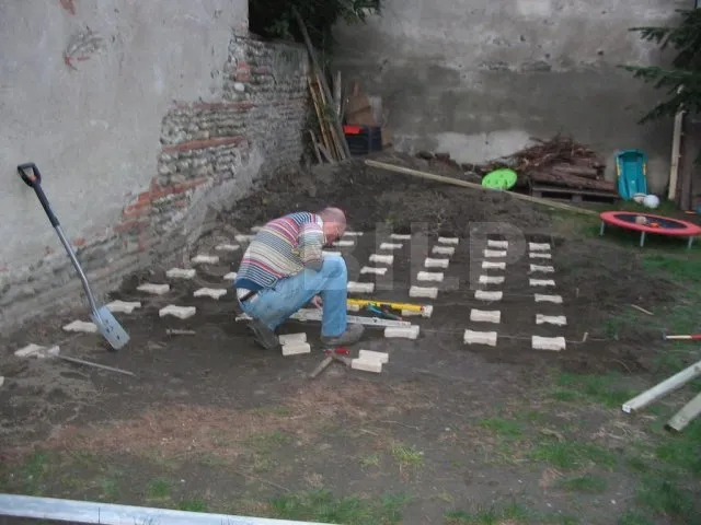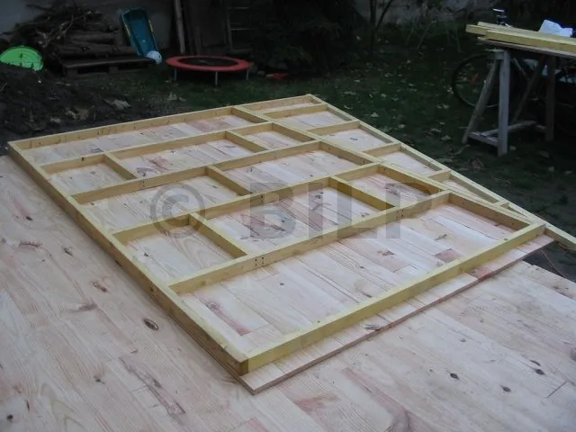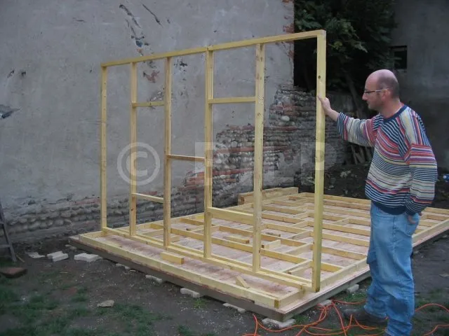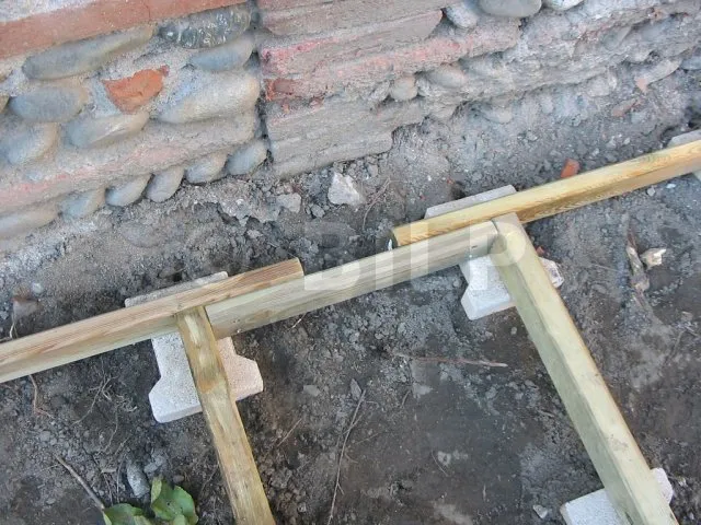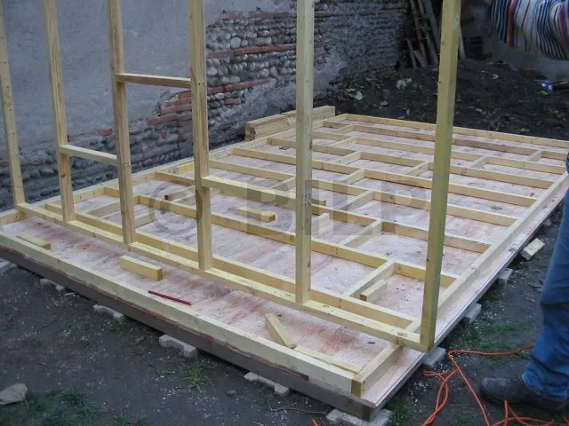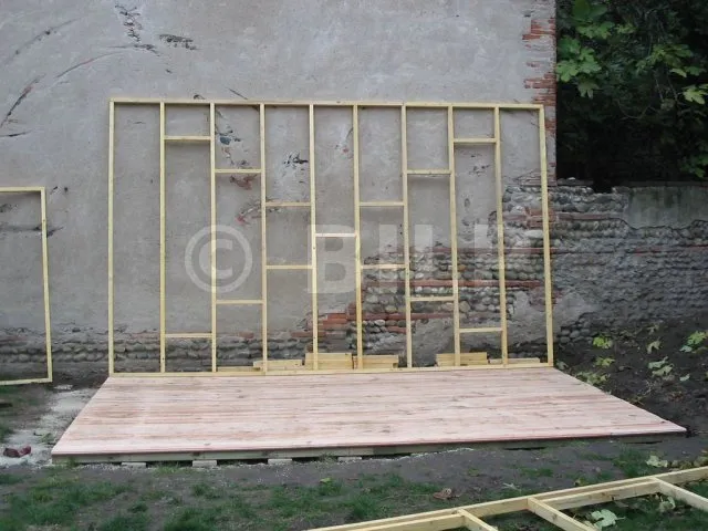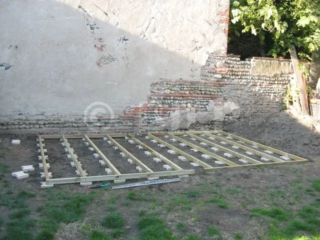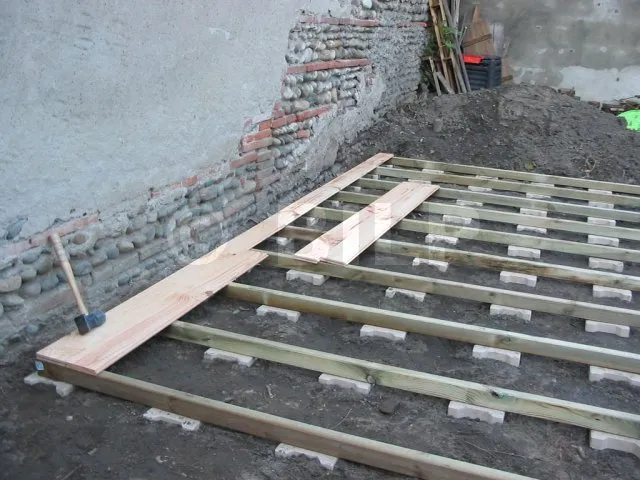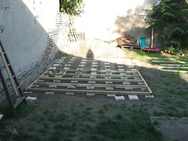 Der Boden wurde hergestellt, indem Parkettdielen auf Holzbalken der Klasse 4 befestigt wurden. Die Lagerhölzer wurden ohne Befestigung auf Verbundpflastersteinen verlegt. Das Eigengewicht des Baumhauses wird ausreichen, um die Verankerung zu gewährleisten.
