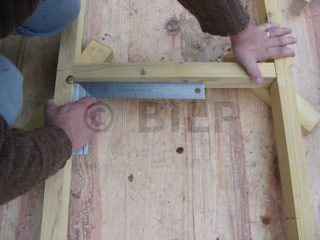 Man befestigt an den Enden einen senkrechten Kantholzbalken, um das Ganze zu fixieren.