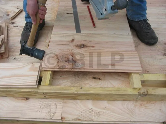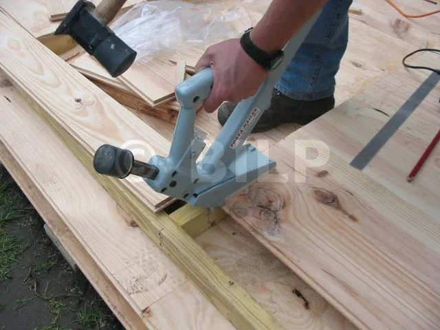 Man benutzt ein spezielles Werkzeug, um die Dielen zu befestigen