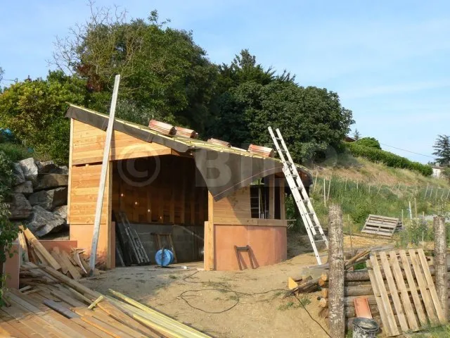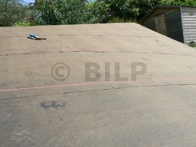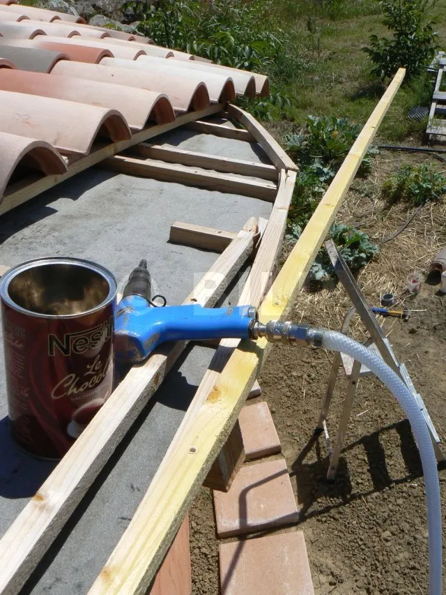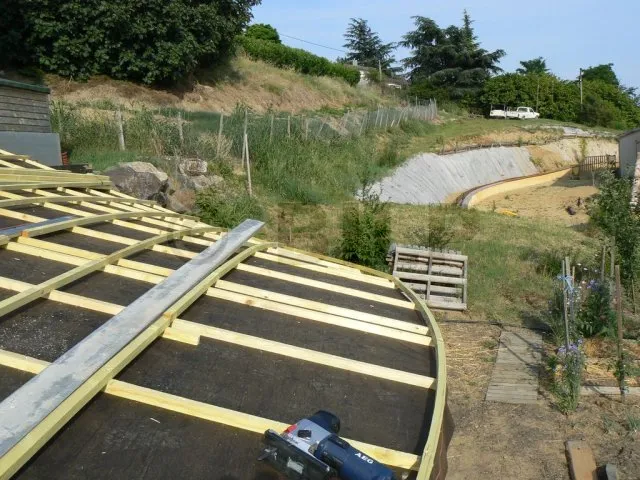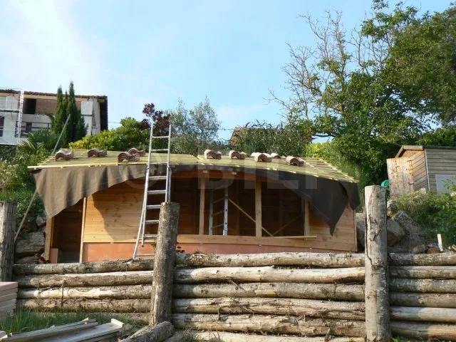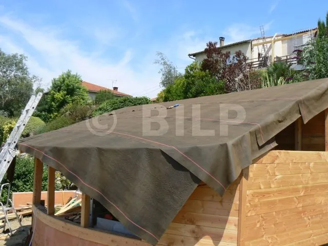 Wir erinnern uns : Das Dach ist gewölbt. Die Enden des Bogens sind ziemlich schräg. Auf der rechten Seite besteht die Möglichkeit, dass das Regenwasser nicht richtig abfließt und bei starkem Unwetter unter die Dachziegel dringt. Aus diesem Grund habe ich für Sicherheit gesorgt, indem ich eine Regenschutzfolie angebracht habe. Dadurch wird jegliches Eindringen verhindert, auch im Falle von zerbrochenen oder verschobenen Dachziegeln. Diese Regenschutzfolie ist aufgrund der Konfiguration unerlässlich. Bei einem geraden Dach hätte ich sie mir jedoch sparen können. Es ist schließlich nur eine Hütte. Bei einem dauerhaften Haus hingegen ist die Folie fast obligatorisch.