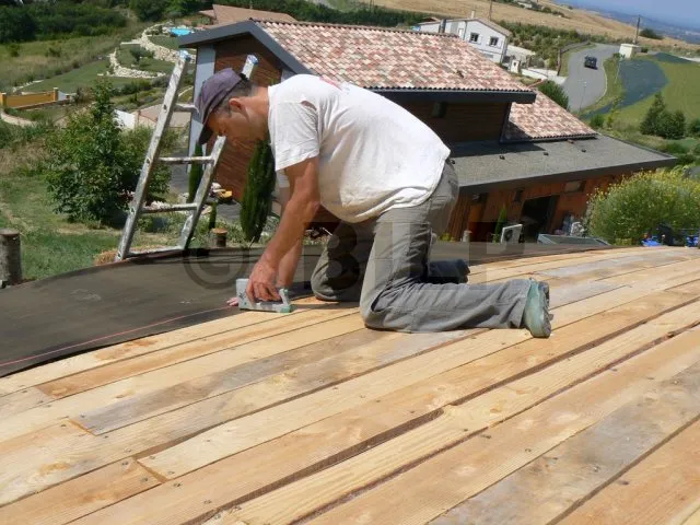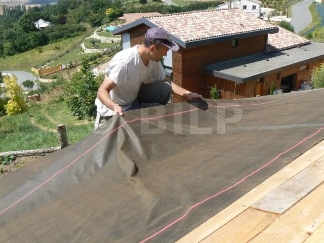 Zuerst wird die Folie von der Unterseite des Daches senkrecht zur Fließrichtung getackert. Dann werden die anderen Folien nacheinander befestigt ; eine Folie überlappt die vorherige um etwa 20 cm. Es ist zu beachten, dass das Anbringen der Folie bei heißem Wetter vermieden werden sollte, insbesondere bei schwarzen Folien auf Bitumenbasis. Während des Anbringens ist man gezwungen, auf die Folien zu treten, und die Hitze neigt dazu, die Beschichtung zu schmelzen. An allen Enden ist ein Überhang der Folie von mehreren Dutzend cm vorgesehen, der später nachgeschnitten wird.