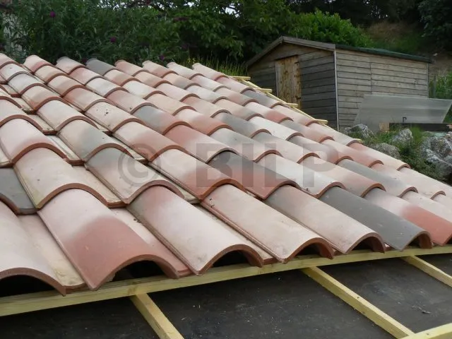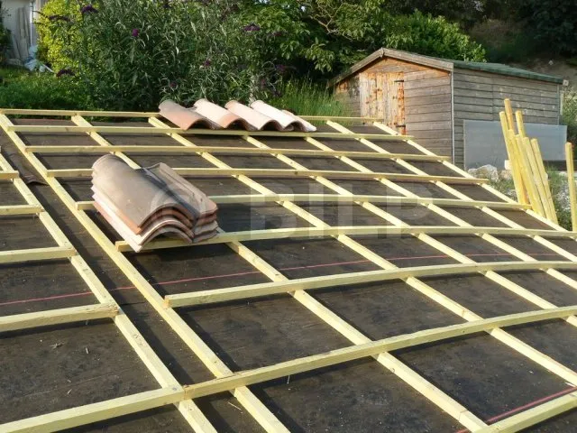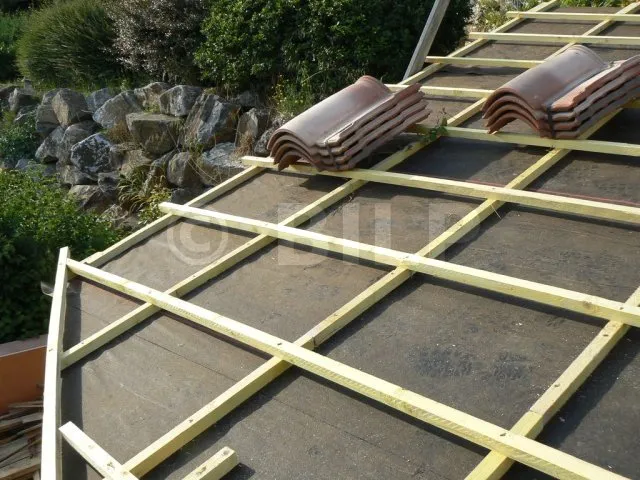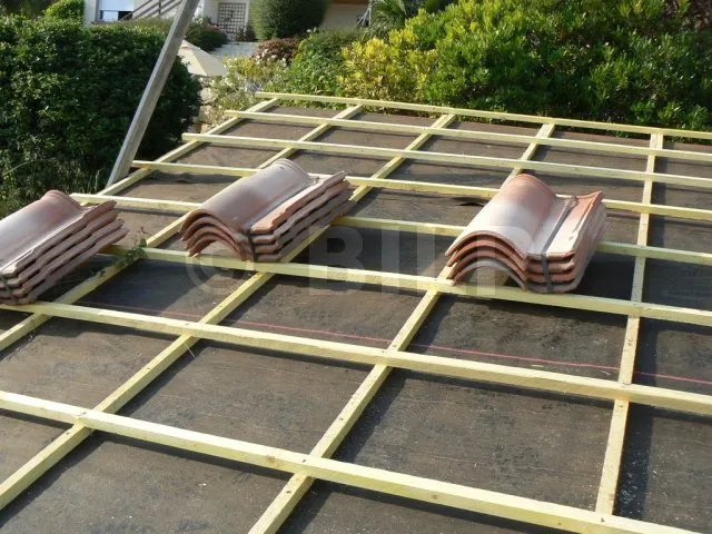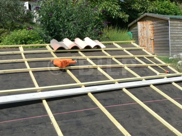 werden die Dachziegel auf Latten verlegt, die in regelmäßigen Abständen senkrecht zum Abfluss befestigt werden. Im Falle eines Lecks und eines Abflusses über die Regenschutzwand darf kein Hindernis den Wasserabfluss behindern. es ist daher verboten, die Ziegellatten direkt auf der Regenschutzwand zu verlegen. Ich habe also eine Reihe Dachlatten hinzugefügt, die ich parallel zum Abfluss befestigt habe. Dann werden die Ziegellatten auf dieser ersten Lattenreihe befestigt.