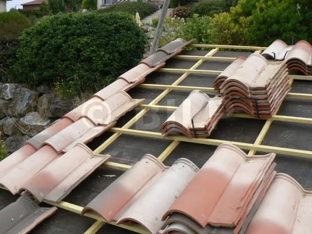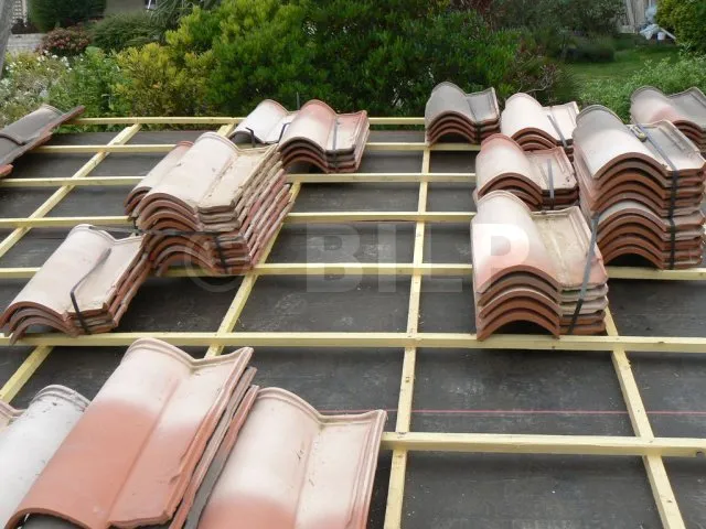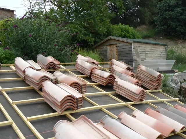 Man verteilt die Pakete so, dass die Bewegungen und Verschiebungen während des Verlegens der Dachziegel möglichst gering sind. Man muss also gut berechnen, wie viele Dachziegel man pro m² benötigt, und die Pakete entsprechend anordnen. Die linke Seite des Daches wird auf mehreren Dutzend Zentimetern von Paketen befreit, da dort mit dem Verlegen begonnen wird.