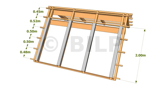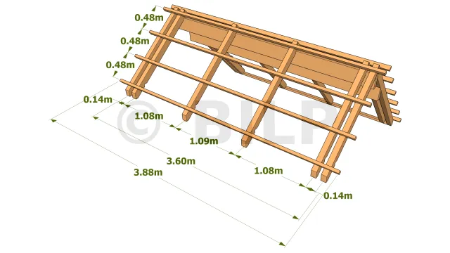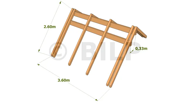 Id. Désignations Section Longueur Qté T1 Pannes 22.5x7.5 cm 360 cm 2 T2 Chevron (façade principale) 11x7.5 cm 259.66 cm 4 T3 Chevron (façade postérieure) 11x7.5 cm 169.83 cm 4 T4 Lattes 6x4 cm 388.04 cm 2 T5 Lattes 6x4 cm 24.5 cm 8 T6 Bande de rive (façade postérieure) 2.1x19.5 cm 392.05 cm 1 T7 Bande de rive (latérales gauche et droite postérieure) 2.1x19.5 cm 161.7 cm 2 T8 Bande de rive (latérale gauche droite face) 2.1x19.5 cm 264.23 cm 2 T9 Plaque en H 2.7x6.4 cm 200 cm 4 T10 Support des plaques en H 6x4 cm 200 cm 2