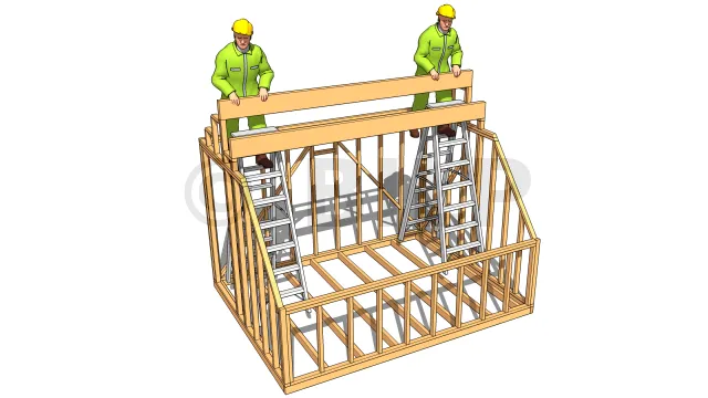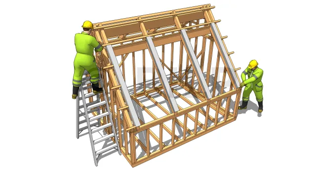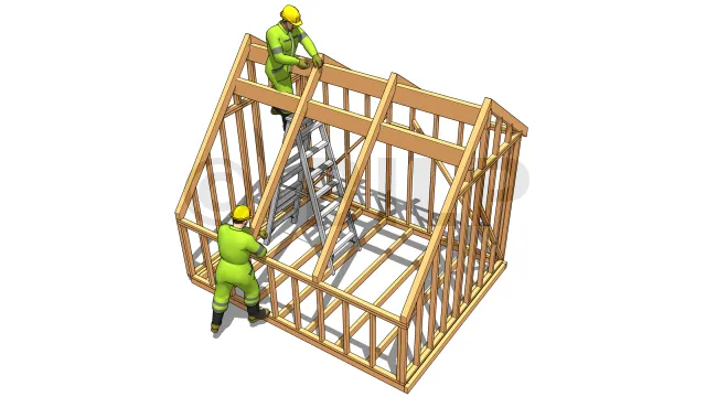 On peut observer que notre atelier présente une toiture à deux pente, de se faite, les chevrons ne seront pas de même longueur. Penser à présenter deux longueur de coupe bien distinct. Pour le raccordement des chevrons, utilisez des plaques métalliques plates fixées à l’aide de boulons. Les chevrons sont fixés aux lisses haut par des vis et aux pannes par des équerres.