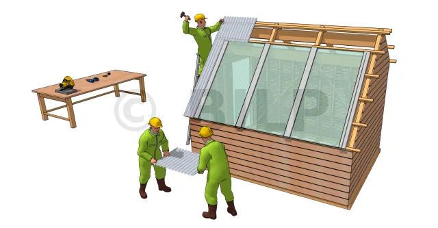 Prendre des mesures exactes avant de découper les plaques. Pour la partie vitrée, penser à ce que la plaque de polyester couvre une partie de la plaque en polycarbonate de façon à éviter les infiltrations des eaux de pluies. Mais noter que la plaque de polyester ne doit pas reposer sur la plaque de polycarbonate, donc mettre une différence de niveau de 10 mm à peu près.
