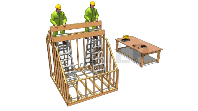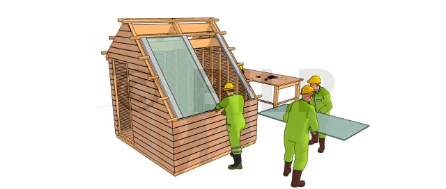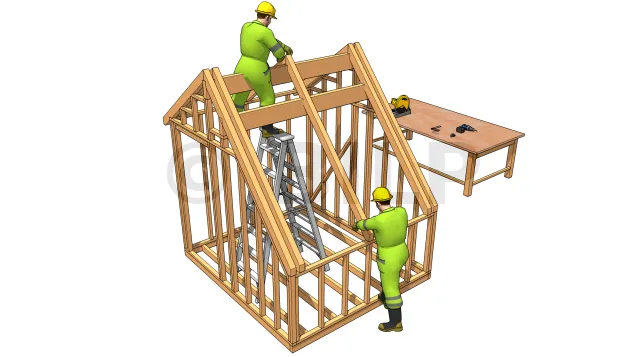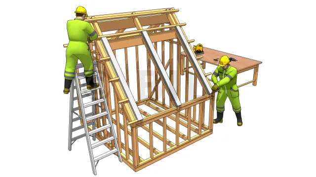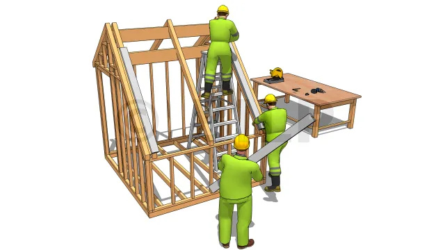 On peut observer que notre atelier présente une toiture à deux pente, de se faite, les chevrons ne seront pas de même longueur. Pensez à présenter deux longueur de coupe bien distinct. Pour le raccordement des chevrons, utilisez des plaques métalliques plates fixées à l’aide de boulons. Fixer les chevrons aux lisses hautes par des vis et aux pannes par des équerres.