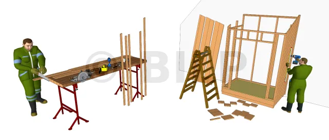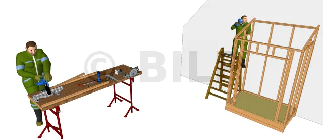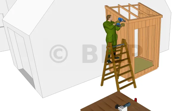 Découpez à la bonne longueur ces chevrons inclinés, repérez sur les lisses hautes des murs de devant et de derrière les emplacements de ces chevrons et fixez-les ensuite avec des vis D6 L100. Pour bien réussir les coupes des angles, utilisez une scie à onglet. De même pour le chevron horizontal de devant.