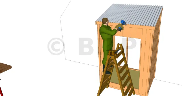 Les chevrons présentent un angle de 18° pour la toiture. Aidez-vous d’une scie à onglet pour les découpes. Fixez-les alors sur les lisses hautes des ossatures avec des vis. Pour les liteaux, découpez simplemet à la bonne longueur et fixer sur les chevrons avec les bons écartments.