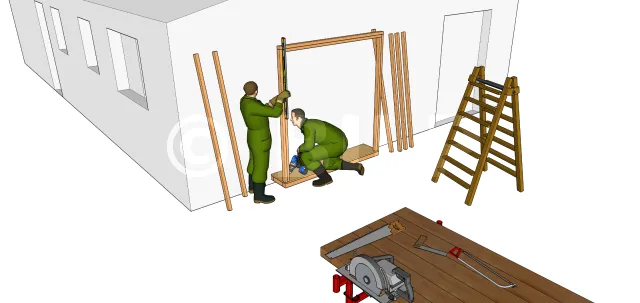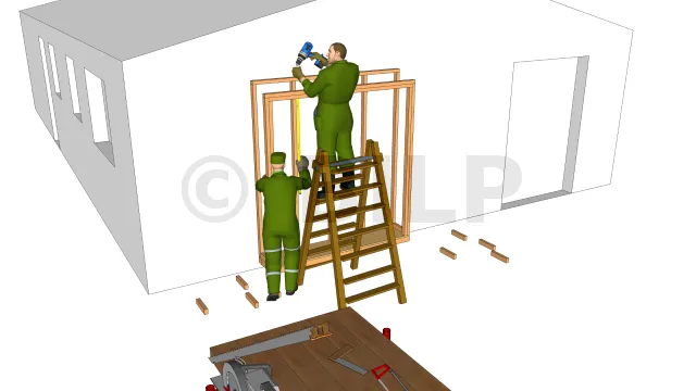 Pour la fixation des ossatures sur le plancher, il faut être deux personnes car il faut en même temps vérifier la verticalité et fixer sur le plancher les éléments un à un.
