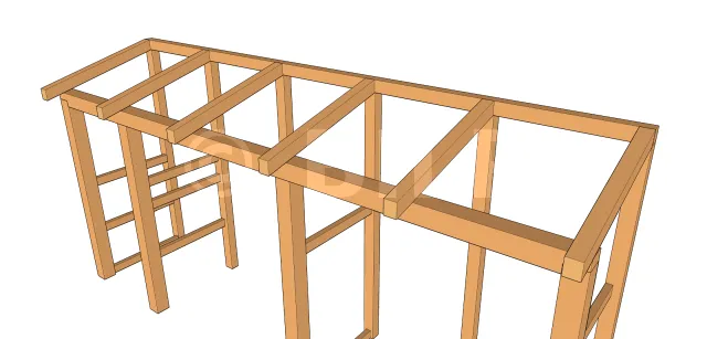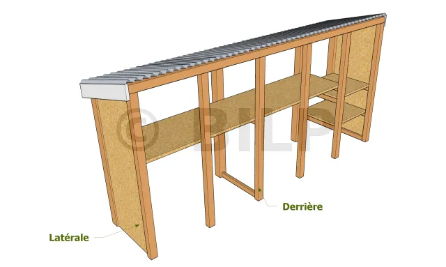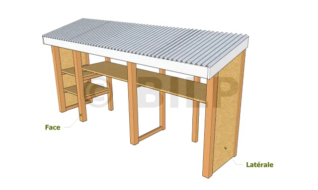 Composition globale de la structure Nomenclature du mur de FACE Nomenclature des murs LATERAUXet INTERMEDIAIRES Nomenclature du mur DERRIERE Nomenclature de la toiture: chevrons Nomenclature de la toiture: closoirs Nomenclature du bardage Nomenclature des plateaux Nomenclature des bandes de rive Nomenclature de la couverture en plaque polyester Und viele hochauflösende Illustrationen :