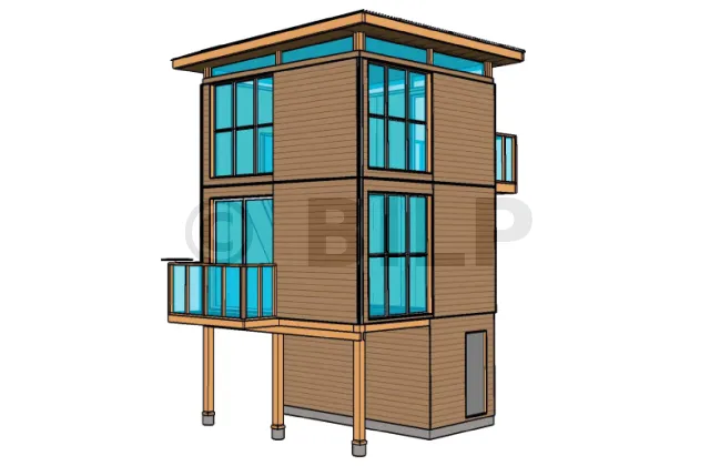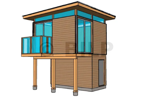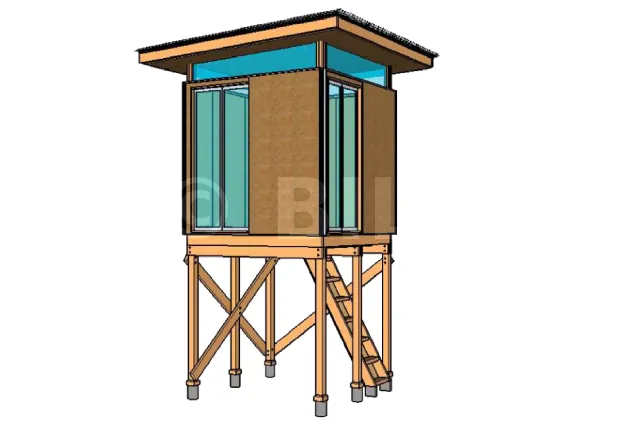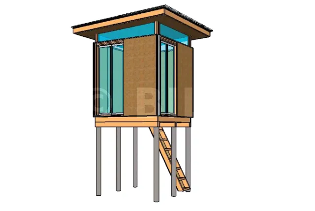 Dies ist ein ultramodernes Baumhaus, das auf Holzpfählen gebaut ist und über Glasfronten verfügt. Es ist auch denkbar, dass Ihr Bau auf Betonpfählen ruht, sodass Sie dieses Modell in einem Gebiet mit hohem Hochwasserrisiko bauen können. Für die Wandverkleidung haben Sie die Wahl zwischen Verkleidungsbrettern und Sperrholzplatten.